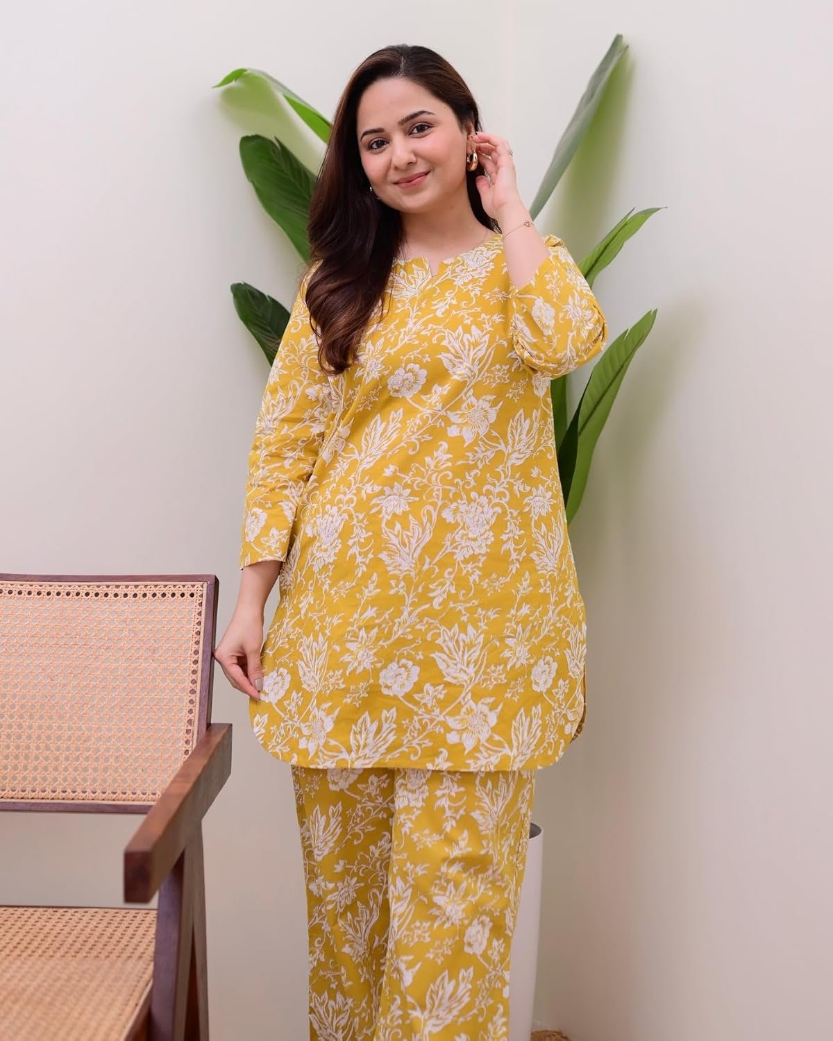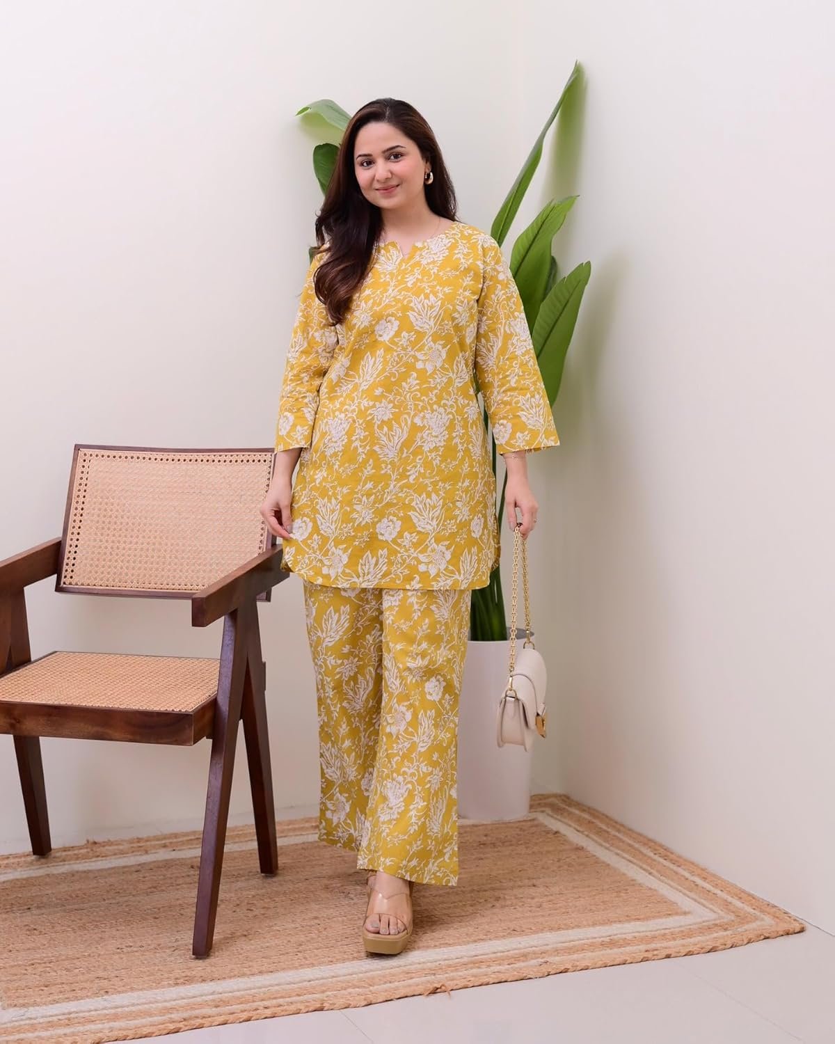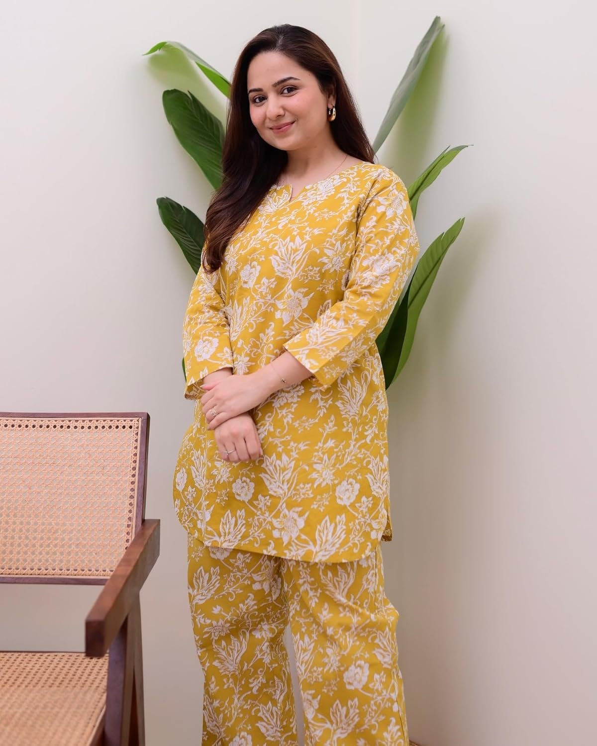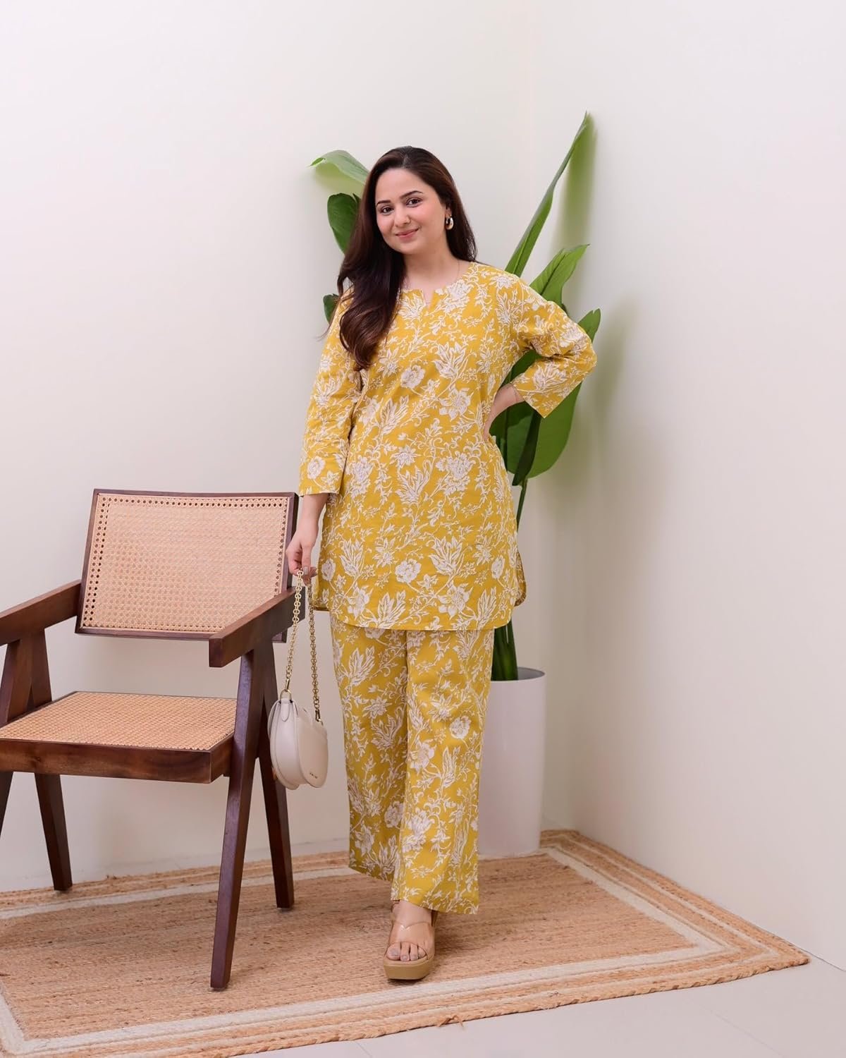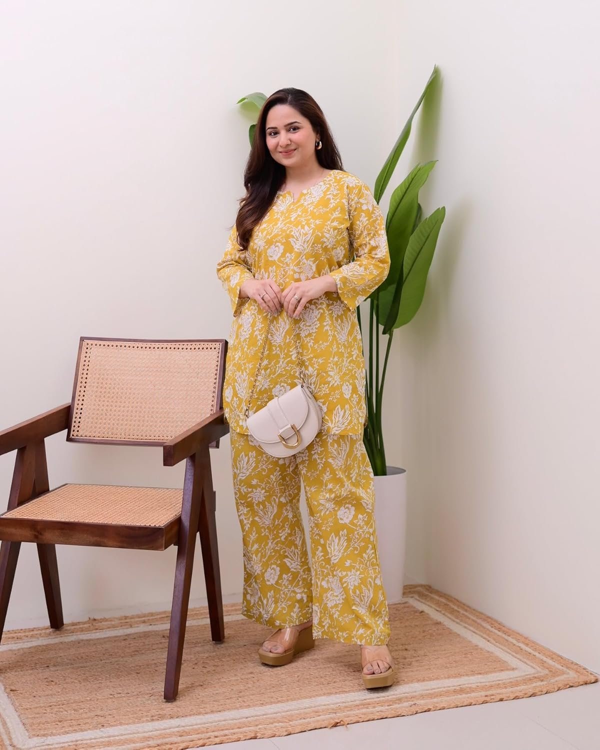 MEERA FAB Women Printed V-Neck Pure Cotton Tunic with Trouse…