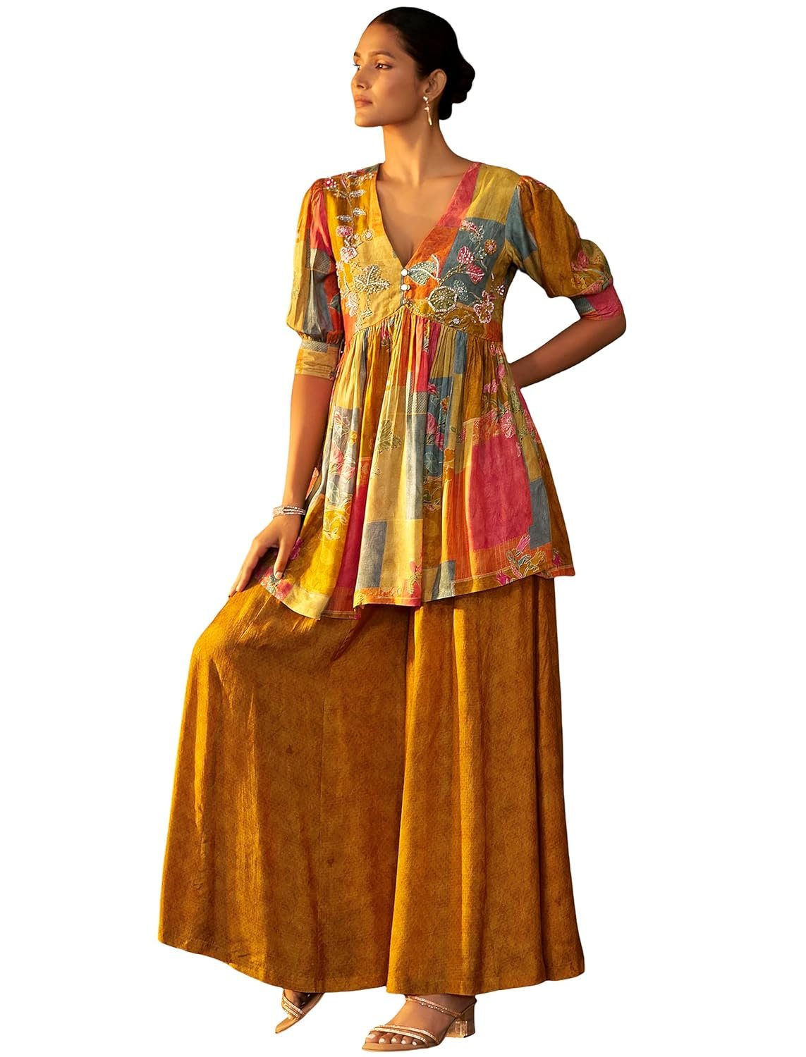 Women’s Silk Embroidered Kurta with Flared Palazzo Ethnic Co…